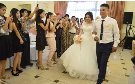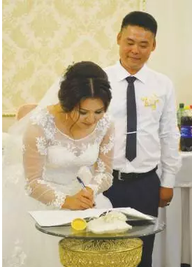 西式婚礼晚宴上,新人双方的亲朋好友、同事伙伴共聚一堂,甚至还有从乌兹别克斯坦和哈萨克斯坦专程赶来赴宴的亲友, 为一对新人送上新婚祝福。简单而庄重的仪式上,司仪念出那句经典的“无论富贵贫穷,无论健康疾病,无论人生的顺境逆境,在对方最需要的时候,你能不离不弃终身不离开,直到永远吗?”后,玛丽卡坚定回答“我愿意!”全场欢呼,并见证二人现场在结婚证书上签名,相互戴上戒指,成为法定夫妻。