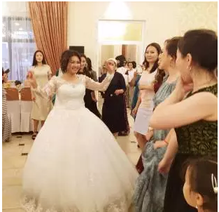 从乌兹别克斯坦和哈萨克斯坦专程赶来赴宴的亲友在西式晚宴上跳舞欢庆。