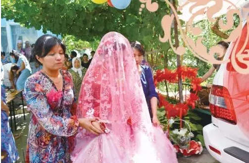 玛丽卡并不喜欢绣花大襟长袍的传统嫁衣,纱裙才是她的心头爱。在传统的娘家婚礼上,她穿上了粉色婚纱,但保留了东干族向亲友行礼时用的手帕。