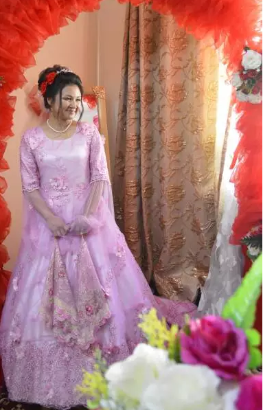 挽青丝,双环结,浓施淡抹巧梳妆。但定神仔细看,此伊人却别有风情。若是依传统,玛丽卡应该梳起东干族保留至今的“燕燕头”,穿上绣花大襟长袍,蹬上绣花鞋,再戴上金银首饰。尽管嫂子娶进门和姐姐出嫁时都是这身行头,可偏她不喜这样的装扮,心里仍惦记着美丽的纱裙,便干脆找婚纱设计师为她量身定做了一身粉色的婚纱。