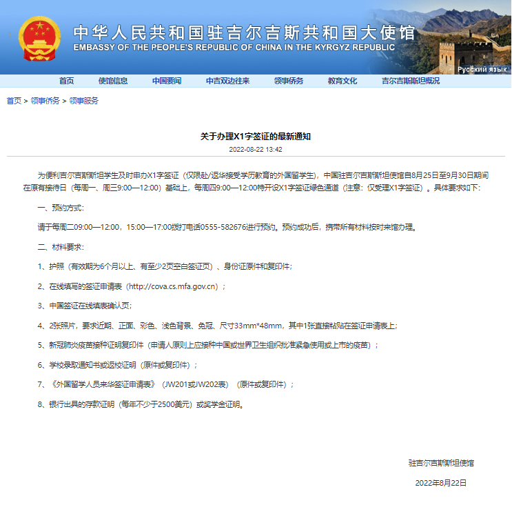 丝路新观察比什凯克8月22日电 为便利吉尔吉斯斯坦学生及时申办X1字签证(仅限赴/返华接受学历教育的外国留学生),中国驻吉尔吉斯斯坦使馆自8月25日至9月30日期间在原有接待日(每周一、周三9:00—12:00)基础上,每周四9:00—12:00特开设X1字签证绿色通道(注意:仅受理X1字签证)。具体要求如下:
