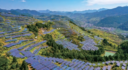 上图:2022年9月7日,俯瞰浙江省杭州市威坪镇叶家村农业与光伏互补示范项目,一排排光伏发电板与周边青山、农居、田园相映成趣,呈现一派乡村振兴的美景。