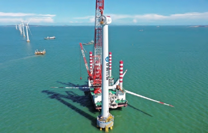 左图:6月12日,福建福清兴化湾二期海上风电场吊装10兆瓦海上风电机组。