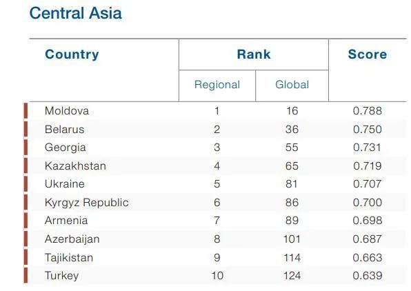 中亚国家中,哈萨克斯坦排名最高(第65位),吉尔吉斯斯坦排名第86位。乌兹别克斯坦和土库曼斯坦未列入榜单。