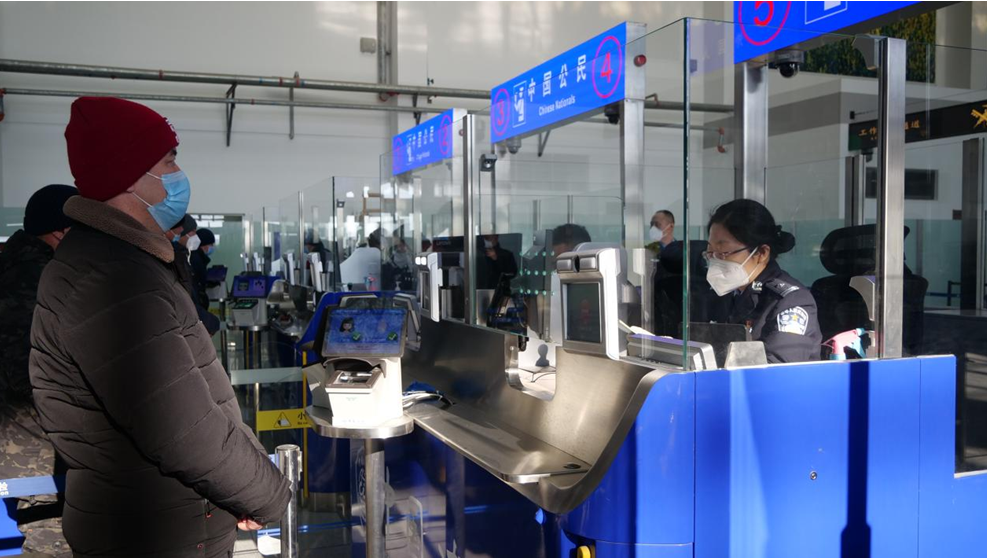 2023年1月8日新疆伊犁霍尔果斯公路口岸旅检大厅内,首批旅客有序入境。永程帆摄)
