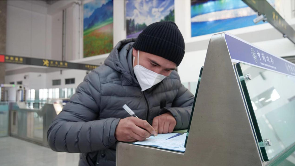 1月8日,新疆伊犁霍尔果斯公路口岸正式恢复客运通关,旅客在填写“外国人入境卡”。永程帆摄