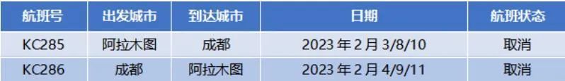 阿斯塔纳航空公司日前发布通知,因运营需要,将对2023年2月部分阿拉木图往返成都航班进行如下调整,已经预定了取消航班的旅客可以免费退票或同舱位改期至48小时内的其他航班。