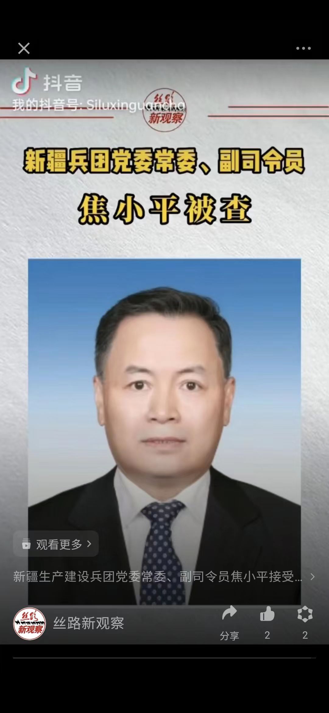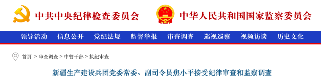 丝路新观察2月5日电 据中央纪委国家监委网站消息,新疆生产建设兵团党委常委、副司令员焦小平涉嫌严重违纪违法,目前正接受中央纪委国家监委纪律审查和监察调查。