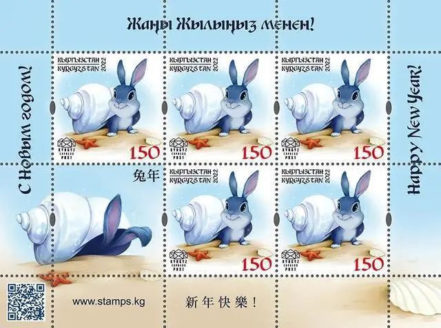 本次发行的兔年邮票的主图是沙滩上一只憨态可掬的蓝色卡通兔子形象,它正从一个大海螺的壳口探出半个身子,沙滩上还有海星和贝壳。小版张中除5枚邮票外,还有一枚邮票形状的附票,图案为大海螺和正在试图向外探出的兔子的两只耳朵。附票上同时印有中文“兔年”字样。小版张四周边纸分别以中文、吉尔吉斯文、俄文和英文印有“新年快乐!”字样。吉尔吉斯斯坦快捷邮政发行该套邮票祝愿广大集邮者与合作伙伴们新年快乐,在2023年健康、幸福、好运和繁荣。