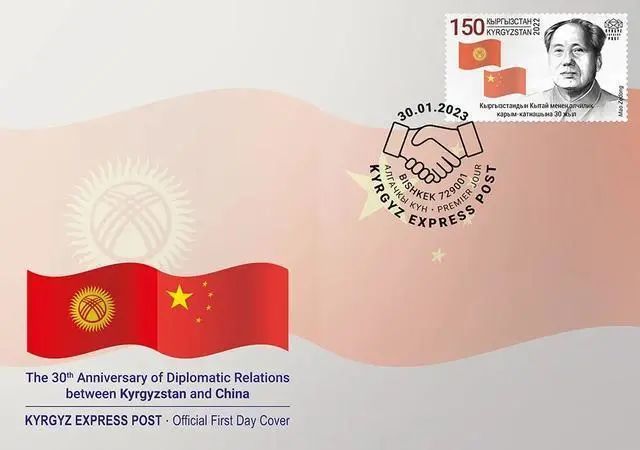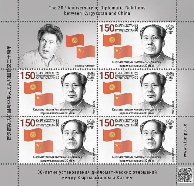 其中关于纪念与中国建交的一枚邮票,展示了中国人民的伟大领袖、中华人民共和国的缔造者毛泽东主席的肖像,同时还为该枚邮票发行了包含5枚邮票的小版张、邮票首日封和极限片,其中小版张边纸上还以中文印有“吉尔吉斯共和国与中华人民共和国建交三十周年”字样,首日封上有两国国旗图案。其他三枚邮票分别展示的是英国的伊丽莎白二世女王、法国的戴高乐和印度的圣雄甘地。
