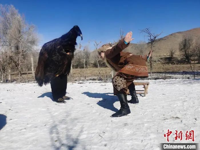 上午的暖阳,洒向乌鲁木齐市达坂城区的大地,换上鹰舞舞服的哈萨克族牧民杰恩斯汗·沙拉皮,在冬不拉乐曲的伴奏声中,与他儿子一起,用舞蹈语言,描述着捕猎的故事。