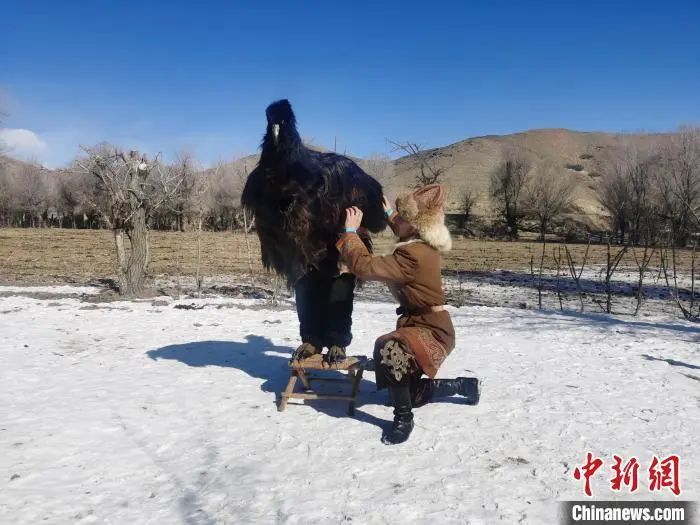换上舞服,杰恩斯汗·沙拉皮的上身都被包裹在舞服中。他跳上板凳,向两侧展开翅膀,再用舞服内的木棍左右调整着鹰的头部,一只扑闪着翅膀的金雕活灵活现展现在眼前。