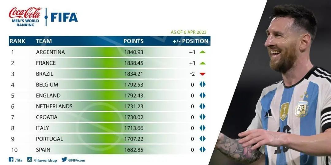 北京时间4月6日,国际足联更新了最新一期的国家队世界排名。世界杯冠军阿根廷排名第1,这是他们时隔六年重返世界第一。法国、巴西分列2、3位,比利时、英格兰、荷兰位居4到6位。