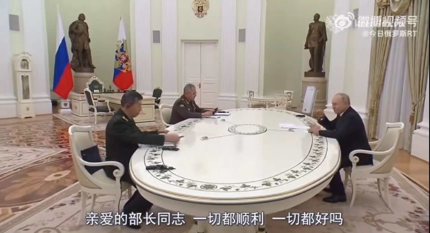 4月16日,俄罗斯总统普京在克里姆林宫与中国国务委员兼国防部长李尚福举行会晤,俄罗斯国防部长绍伊古也出席了本次会晤。