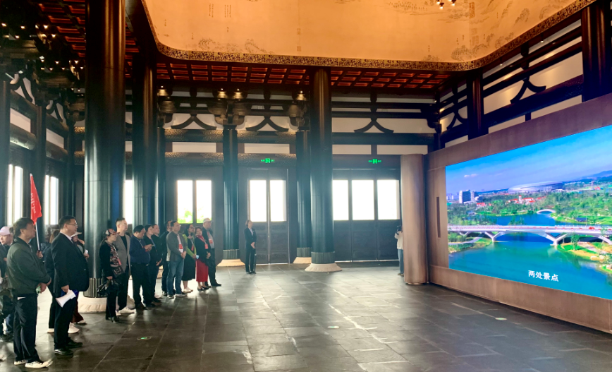 参访团成员登上“东安阁”听取公司高层介绍。中美邮报记者魏炯才 摄