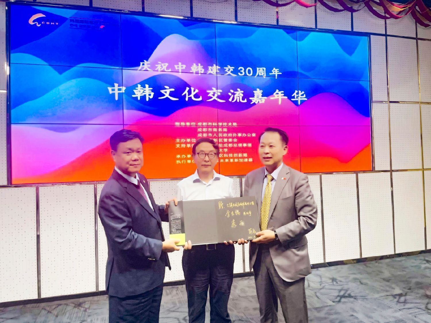 ▲“中韩文化交流嘉年华”活动现场,薛康(中)向韩国驻成都总领事(右)赠送《大熊猫邮集图鉴》