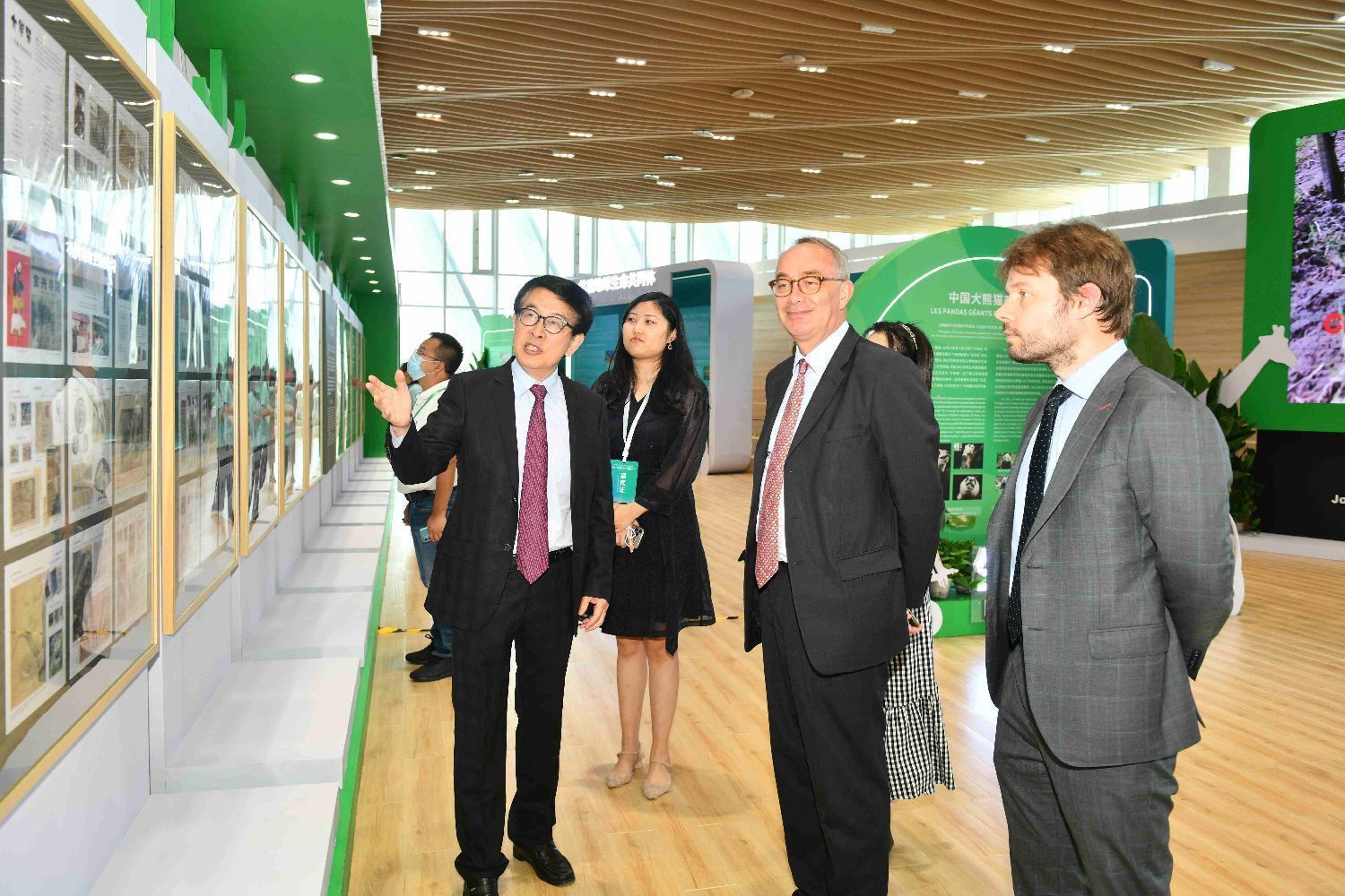 ▲2022年中法生物多样性交流日上,薛康(左)向法国驻成都总领事(右二)介绍《大熊猫邮集图鉴》