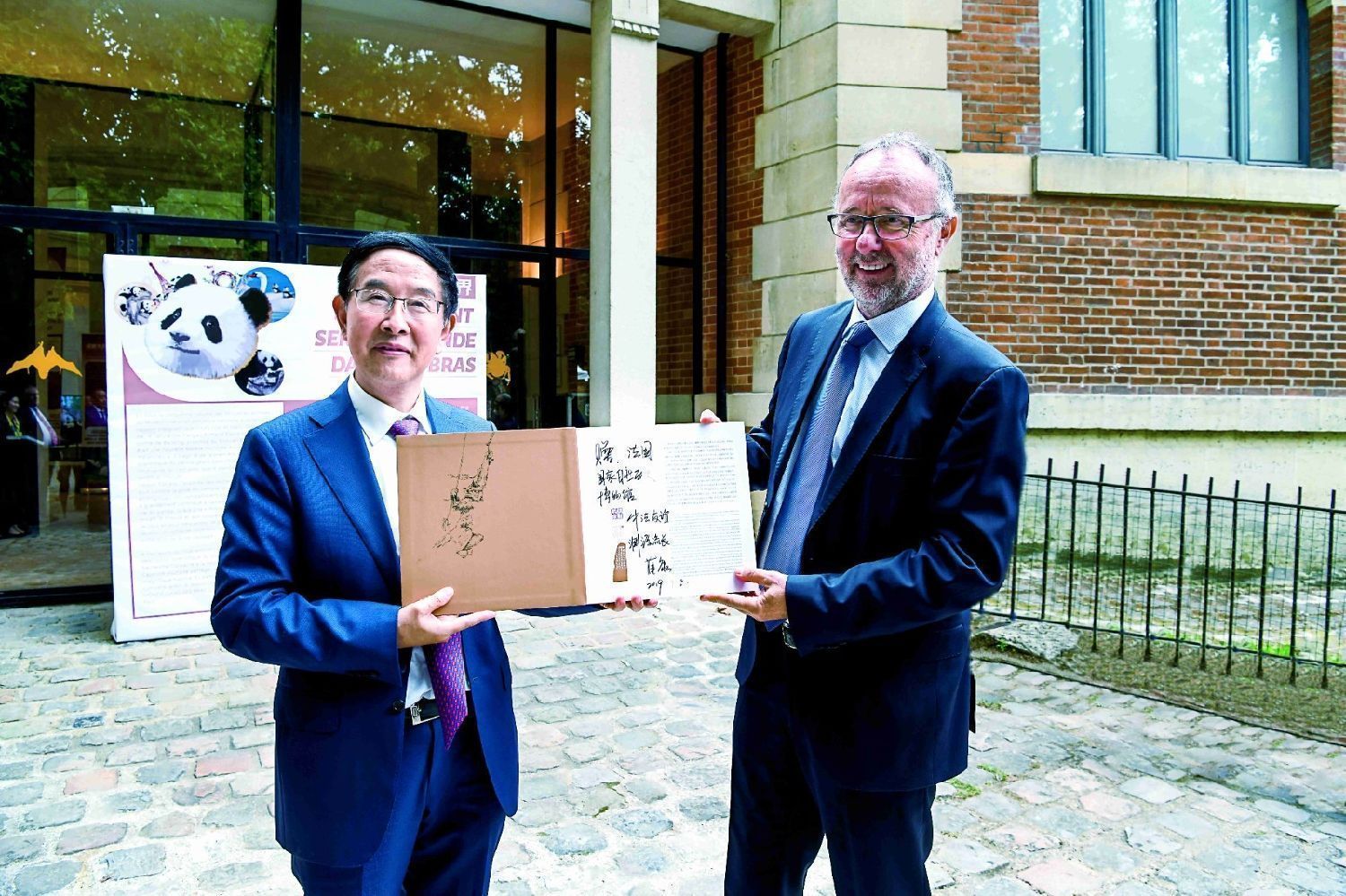 ▲薛康(左)向法国国家自然历史博物馆馆长布鲁诺·戴维赠送金丝猴珍藏纪念册