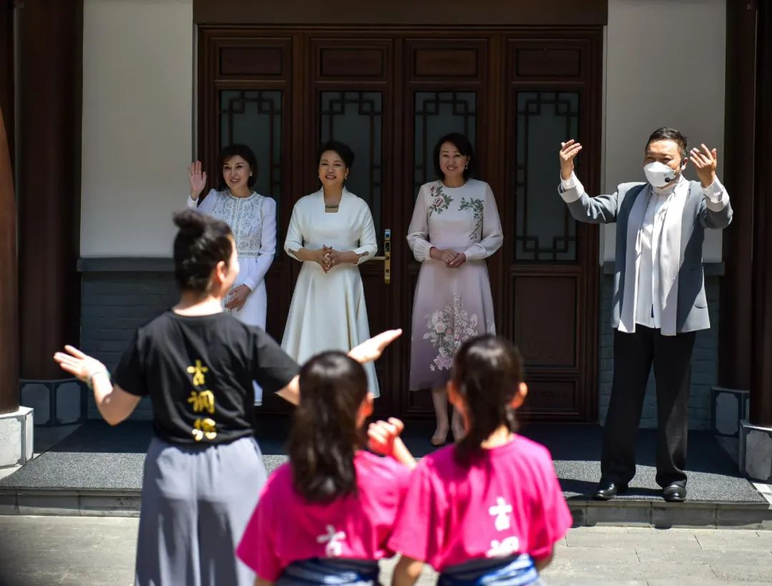 孟夏西安,榴花竞放,秦韵悠长。彭丽媛热情迎接来宾并亲切合影。彭丽媛同来宾们首先参观中国秦腔艺术博物馆,听取秦腔历史起源和发展介绍,并兴致盎然地观赏不同时期的精美秦腔艺术展品。她们驻足于《乐舞图》壁画前,欣赏大唐时期中原与西域乐师合奏的生动场景,以及根据壁画复原的大唐乐舞,感受中国和中亚友好交往的悠久历史。一座座精美的各地秦腔戏楼模型吸引了来宾们的目光,她们详细听取秦腔在中国传播情况的讲解。在易俗社百年手抄剧本展区,彭丽媛和来宾们仔细浏览珍贵秦腔剧本手稿,高度评价易俗社移风易俗、推陈出新、植根人民、服务人民的办社精神。