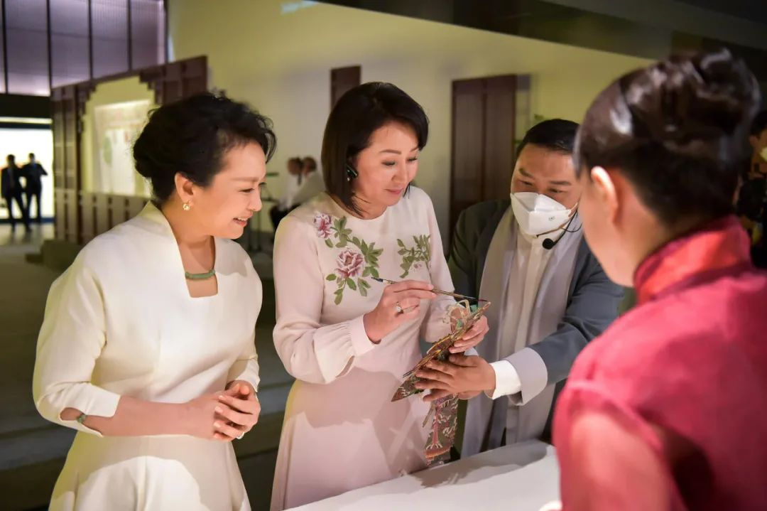 在易俗社展示厅,彭丽媛同来宾们体验皮影制作技艺,她们被色彩丰富、造型生动、工艺精湛的皮影人物所吸引,兴致勃勃地为皮影人物上色点彩。在观看皮影戏表演后,彭丽媛和来宾们来到幕后,和老艺人们亲切交谈。经过庭院时,小学员们正练习唱秦腔、走台步。他们兴高采烈地围拢上来,争相展示自己的唱功。彭丽媛鼓励他们成为弘扬中华戏曲文化艺术的接班人。