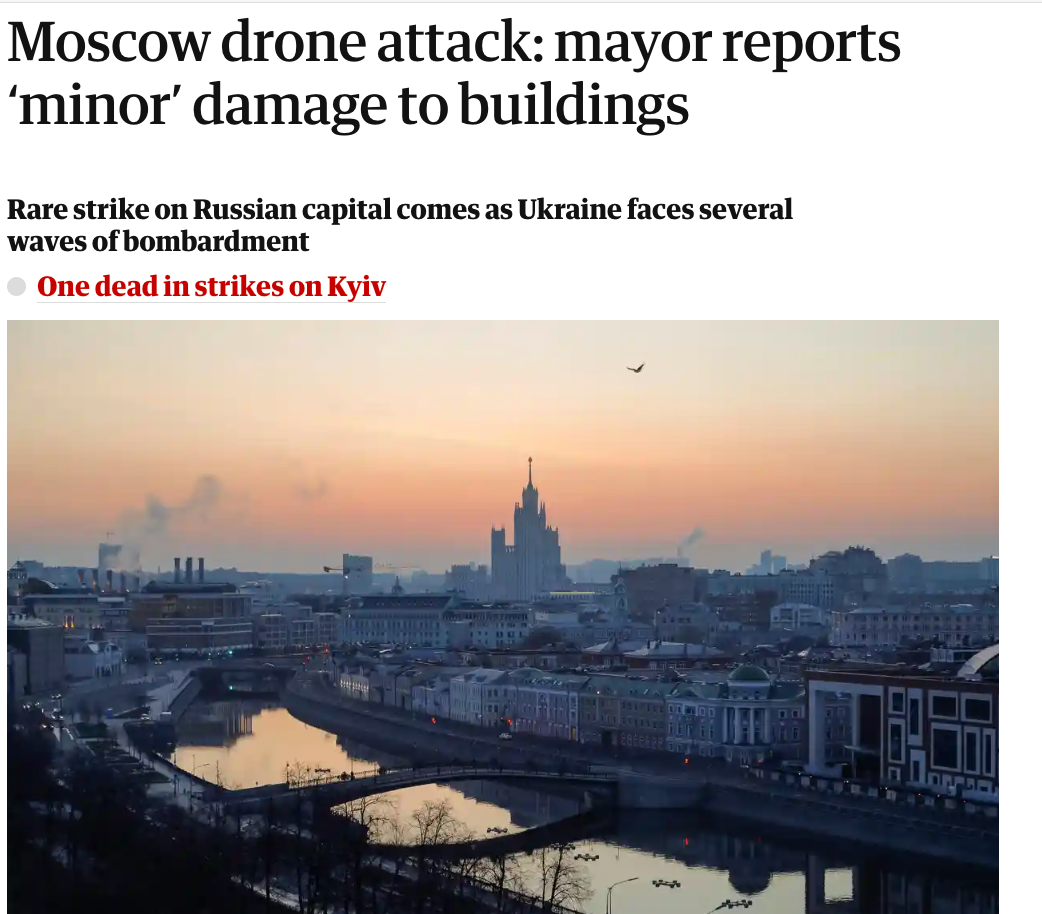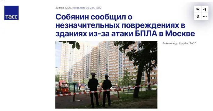 丝路新观察5月30日电 据央视新闻客户端消息,当地时间5月30日,俄罗斯莫斯科市市长索比亚宁发布消息称,该市当日早晨遭到了无人机袭击,导致数栋建筑受到轻微损坏。目前当地紧急情况部门正在现场进行善后工作,没有人员受到严重伤害。