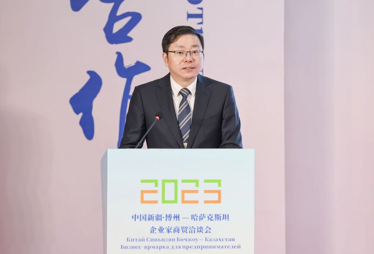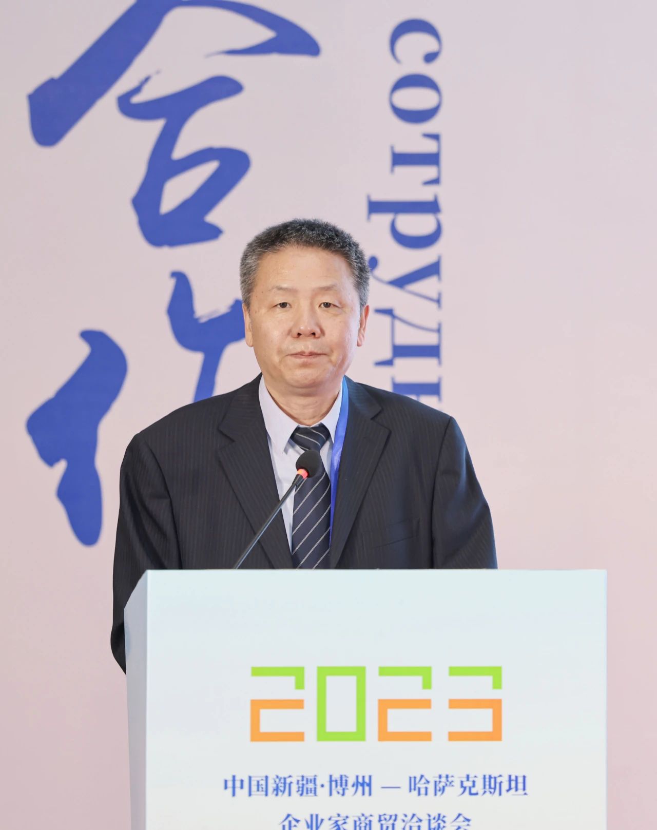 张玉忠代表自治区商务厅对商贸洽谈会的举办表示热烈祝贺。他表示,今年是“一带一路”倡议提出十周年,新疆充分利用国内国际两个市场、两种资源,加快推进丝绸之路经济带核心区建设,积极服务和融入新发展格局。博州区位优势独特、资源潜力巨大,第二座亚欧大陆桥纵贯全境,重点开发开放型平台建设取得积极进展,对外开放大通道功能和作用不断提升,为新疆与哈萨克斯坦经贸合作作出了重要贡献。我们将以今年首届中国—中亚峰会举办为契机,致力于推动丝绸之路经济带核心区高质量发展,积极打造向西开放亚欧黄金通道,进一步释放亚欧陆路物流和贸易通道的潜能、促进沿线国家和地区经济发展、推动国际供应链提质升级、促进国际贸易发展。希望哈萨克斯坦企业家来疆考察交流、投资兴业,共享“一带一路”建设机遇,促进新疆与哈萨克斯坦深化交流合作,实现互利共赢。