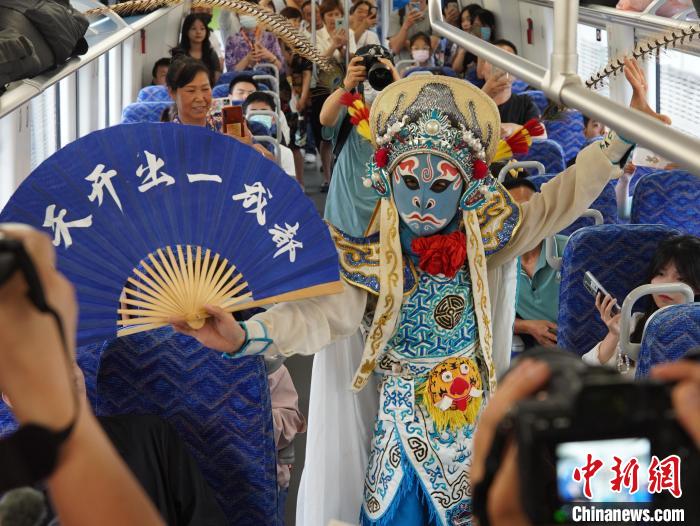 首发列车上,国家级非物质文化遗产川剧变脸传承人现场演绎,吸引了许多乘客。列车上还准备了大熊猫文创产品、成都文旅宣传资料等。(记者王鹏)