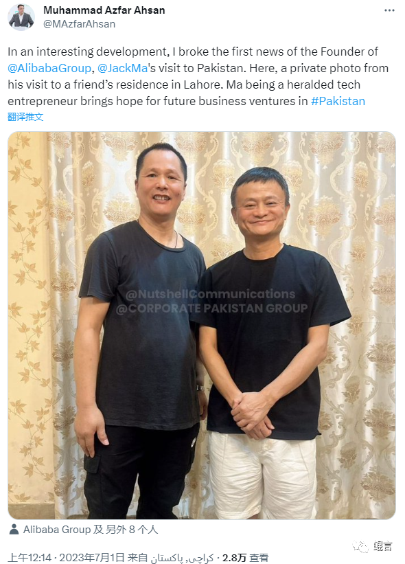 巴基斯坦前国务部长兼投资委员会主席、NutShell集团的创始人阿兹法尔·阿赫桑在社交平台上晒出了和马云的合照。