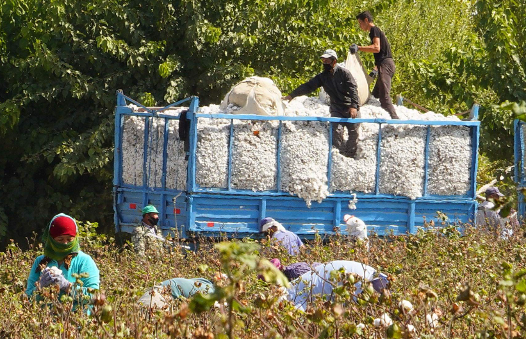 2020年9月24日,在乌兹别克斯坦锡尔河州,棉农在使用中国滴灌技术的棉田里采摘新棉。