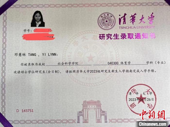 马来西亚“乒乓姑娘”收到清华大学研究生录取通知书。 受访者供图