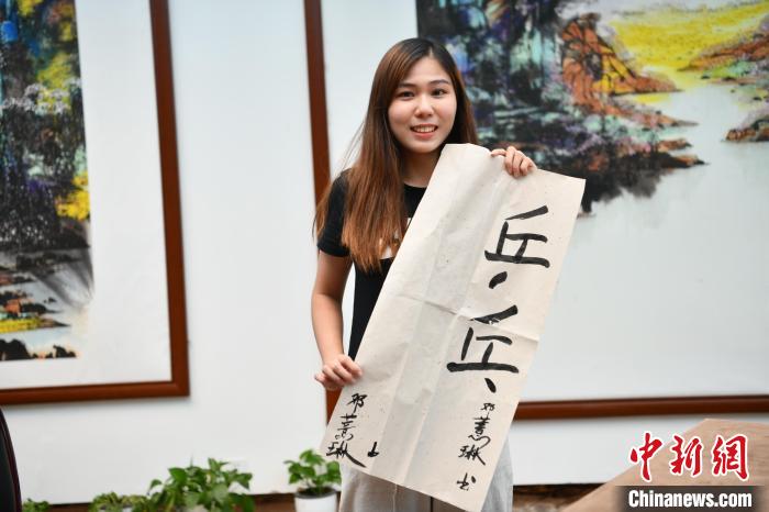 马来西亚“乒乓姑娘”学习中国书法。 张浪摄