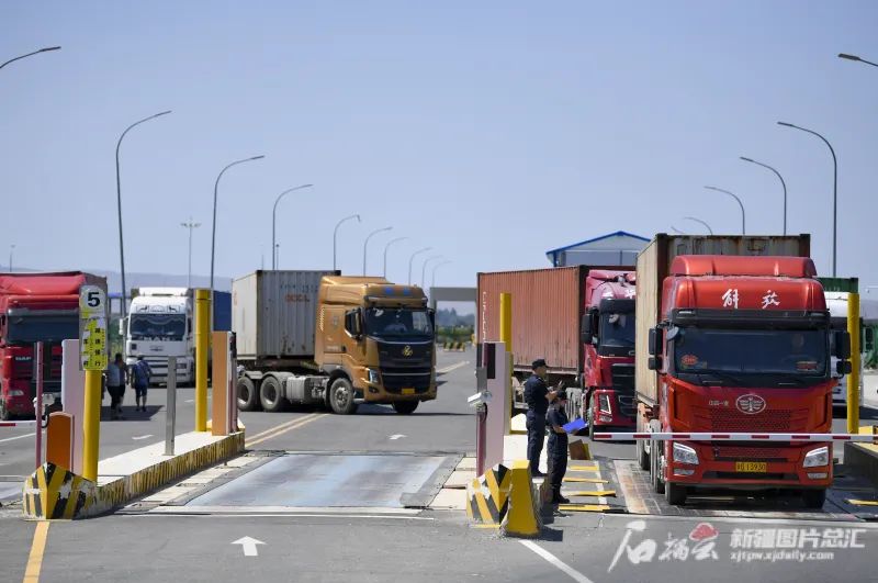 7月21日,入境货车驶入巴克图中哈边民互市监管区。汤永摄