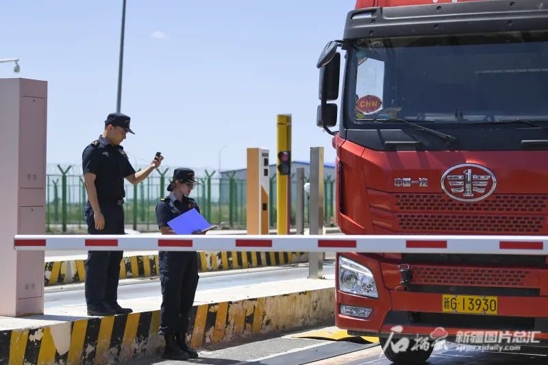 7月21日,塔城海关工作人员对即将离开巴克图中哈边民互市监管区的入境货车进行查验。汤永摄