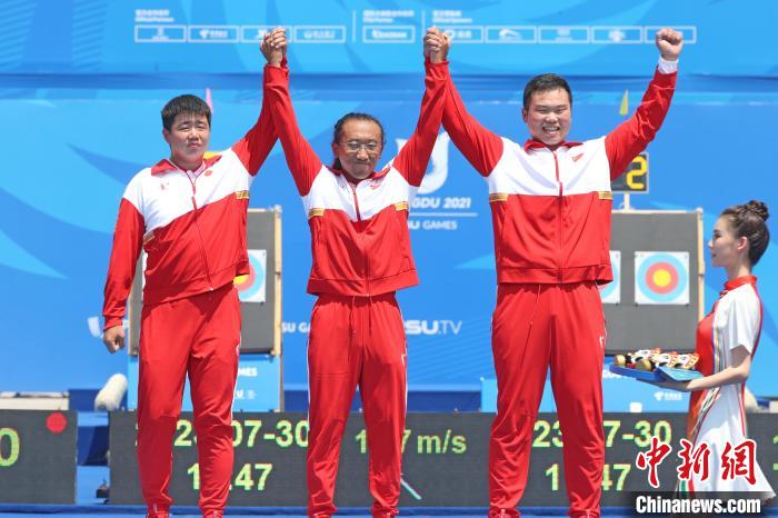 图为夺得成都大运会射箭项目男子复合弓团体金牌的中国队选手站上领奖台。中新社记者刘占昆摄