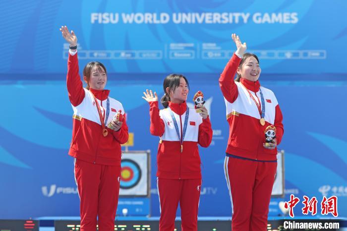 图为夺得成都大运会射箭项目女子反曲弓团体金牌的中国队选手在领奖台上与观众挥手致意。中新社记者刘占昆摄