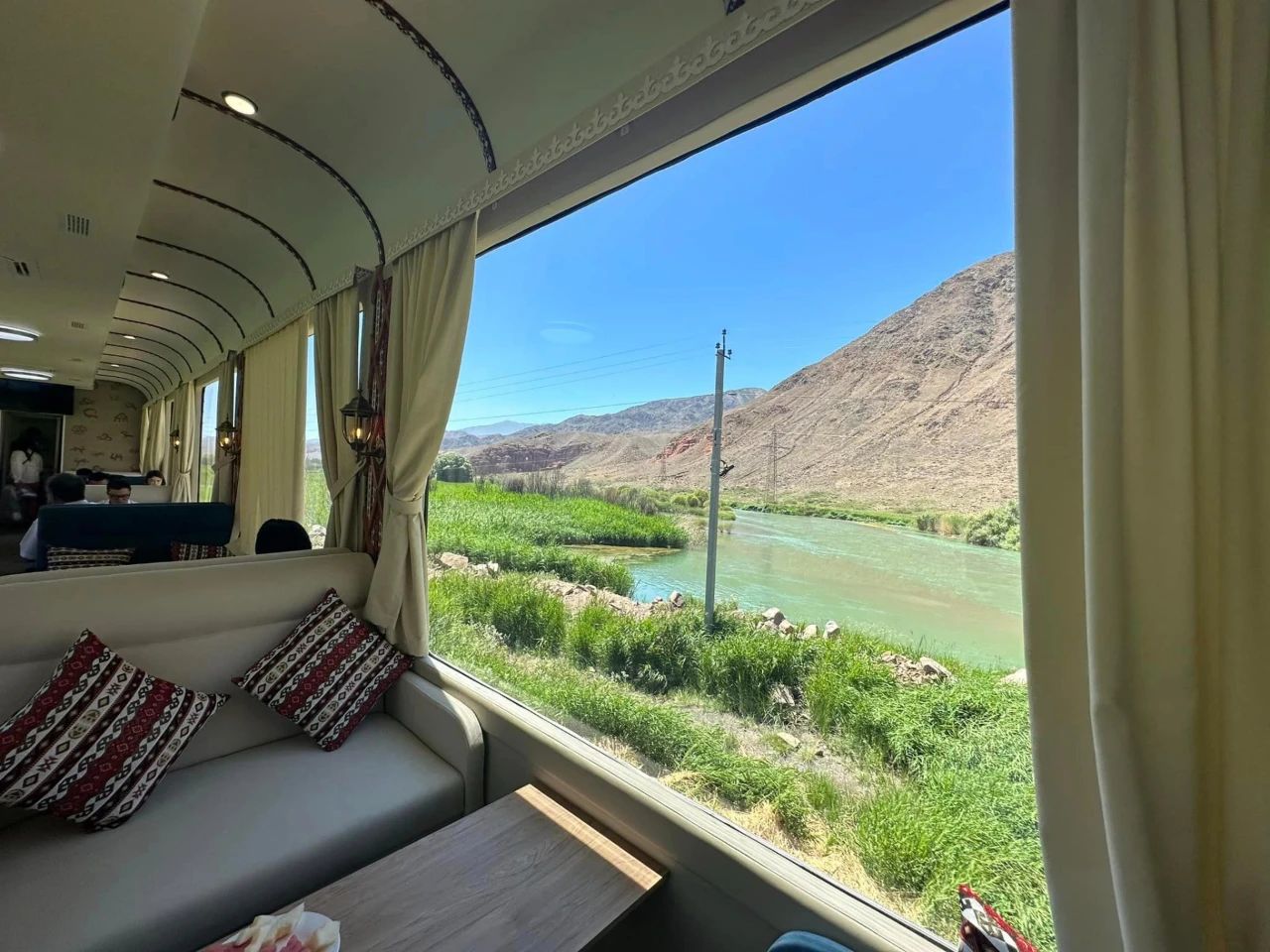 列车由三节豪华车厢组成,配有全景窗、空调、软座和沙发,还增设自助餐。