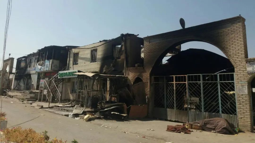 9月16日,吉国巴特肯州一村庄市场因炮击被烧毁。图源吉国卫星网