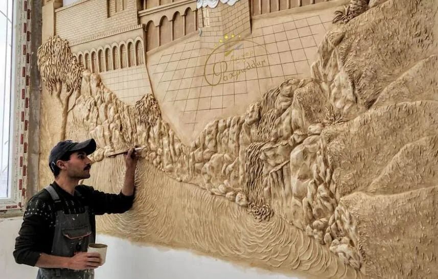 接单时,法赫里丁首先会给出草图,和客户达成一致后再将草图上墙,然后用刮刀制作浮雕的各种细节。