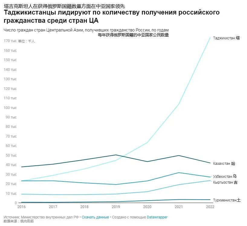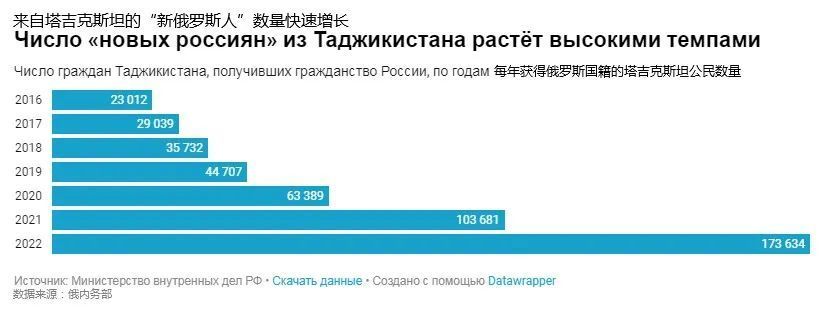 对俄罗斯内务部有关获取公民身份的数据的分析表明,过去七年,获得俄罗斯国籍的塔公民数量增加5.5倍以上。如果把所有公开数据相加,到2022年底,来自塔吉克斯坦的“新俄罗斯人”数量超过83万人。