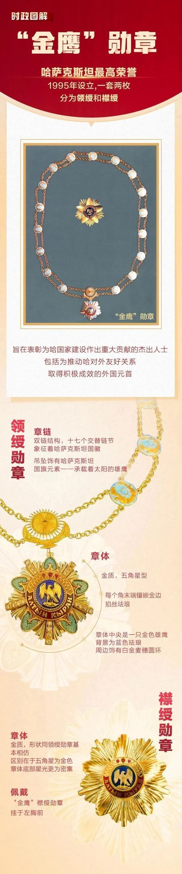 “金鹰”勋章是哈萨克斯坦最高荣誉,旨在表彰为哈萨克斯坦国家建设和对外友好关系作出重大贡献的人士。2022年9月14日,中国国家主席习近平在阿斯塔纳总统府接受托卡耶夫授予“金鹰”勋章。