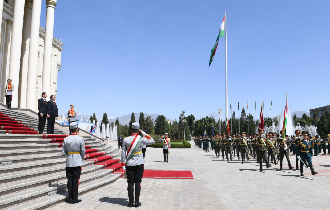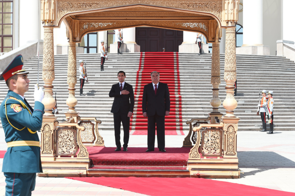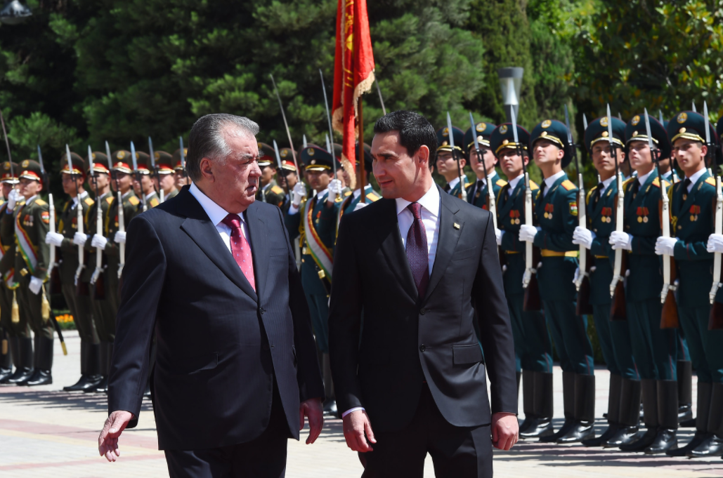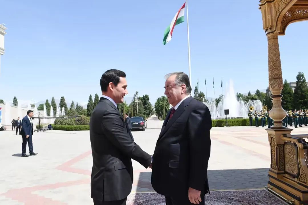 塔吉克斯坦总统埃莫马利·拉赫蒙在民族宫前为谢尔达尔·别尔德穆哈梅多夫举行了正式的欢迎仪式。