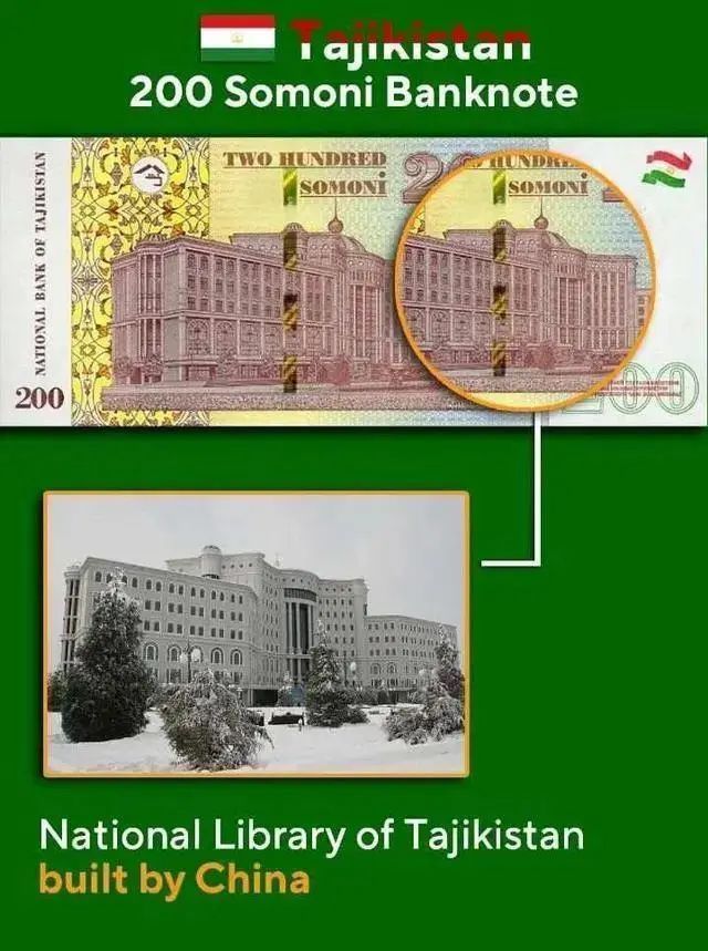 在杜尚别,还有一个建筑十分显眼——塔吉克斯坦国家图书馆。它由中国企业承建,造型犹如一本翻开的书。作为标志性建筑,它还被印在了面额200索莫尼纸币上。