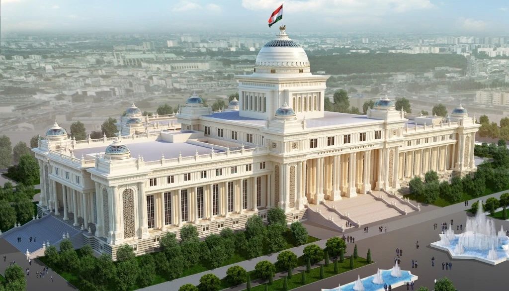 据悉,新议会大楼沿着首都杜尚别市鲁达基大街修建,主楼高49.7米,穹顶高70米,总建筑面积4.3万平方米。