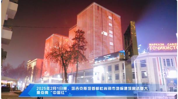 丝路新观察杜尚别2月3日电 2025年2月1日晚,塔吉克斯坦首都杜尚别市地标建筑-鲁达基大厦点亮“中国红”,大厦巨型电子屏幕上上演巨幅灯光秀,滚动播放中国国旗及两国民族传统图案,庆祝中国农历蛇年春节。