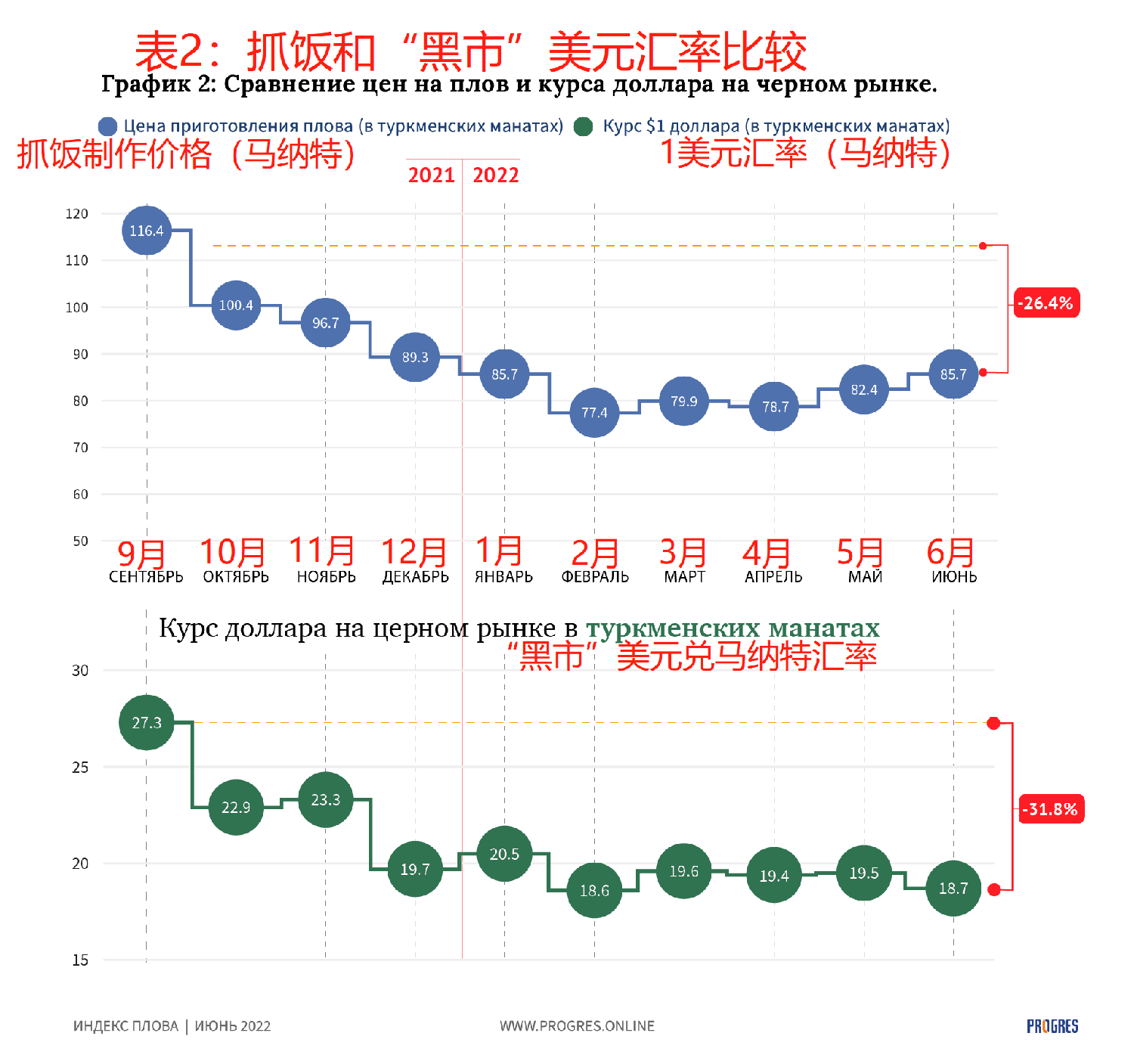 《ProgresOnline》团队从2020年1月开始跟踪抓饭食材价格。当地很少有居民意识到,今年6月的抓饭比去年6月便宜了13.4%。自2022年2月以来,抓饭通胀率开始下降,主要原因是“黑市”美元汇率降低。抓饭指数首次通缩发生在2022年4月和6月,价格分别下降14.2%和13.4%。