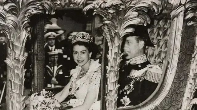 伊丽莎白二世与菲利普亲王坐在黄金马车中,摄于1953年的加冕典礼上。英国皇家收藏信托基金图