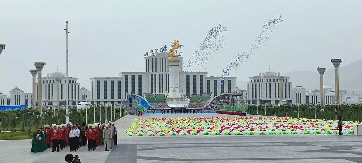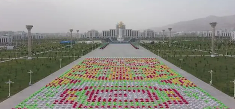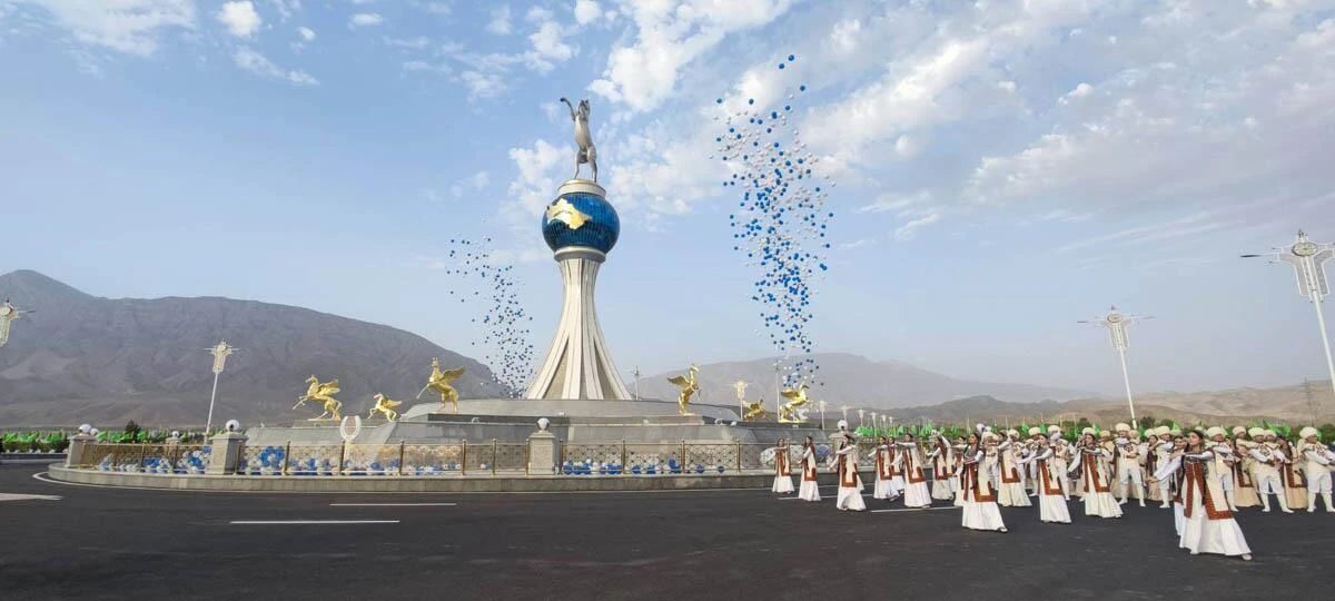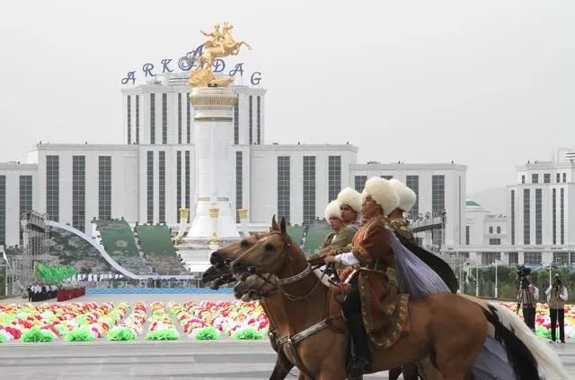 土总统与外国贵宾共同为“阿克汗”纪念雕塑揭幕。“阿克汗”是一匹传奇宝马,被收入吉尼斯纪录。当纪念雕塑上的布被揭开时,五颜六色的气球伴随着音乐升起,喷泉开始喷放。