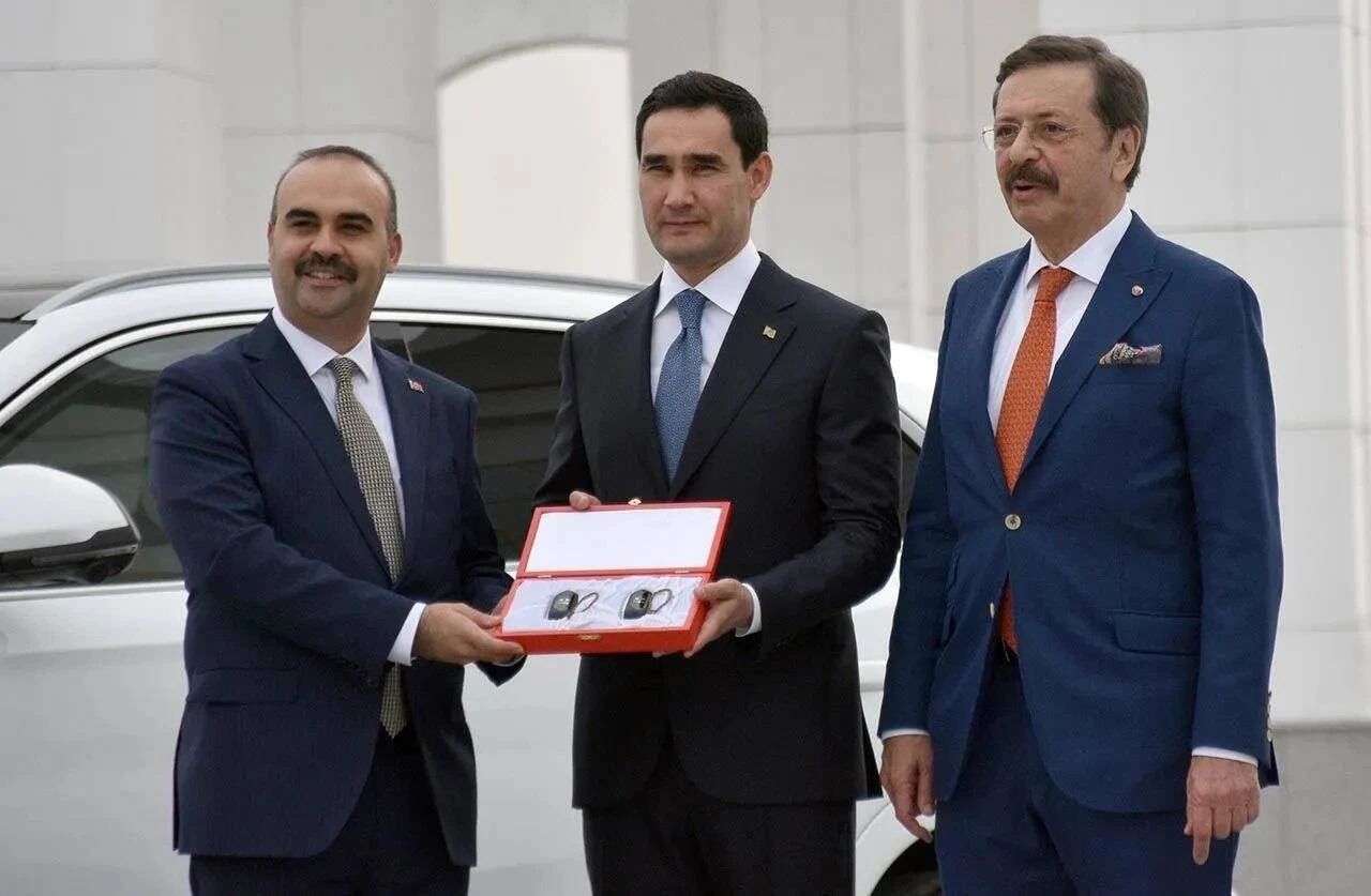 率团参加土库曼斯坦阿尔卡达格市落成庆典的土耳其工业和技术部部长法提赫·卡吉尔代表土耳其总统将车钥匙交给了土库曼斯坦总统谢尔达尔·别尔德穆哈梅多夫。