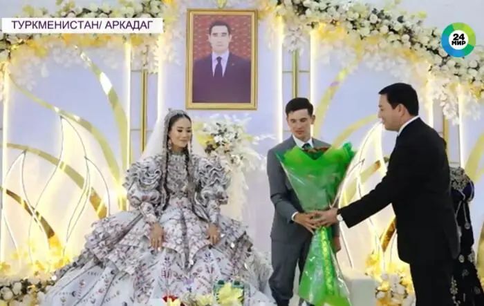 新人阿加格尔季耶夫夫妇按照土库曼斯坦人民古老的传统在阿尔卡达格婚礼宫“Багткошги”(幸福宫)举行了他们的婚礼。